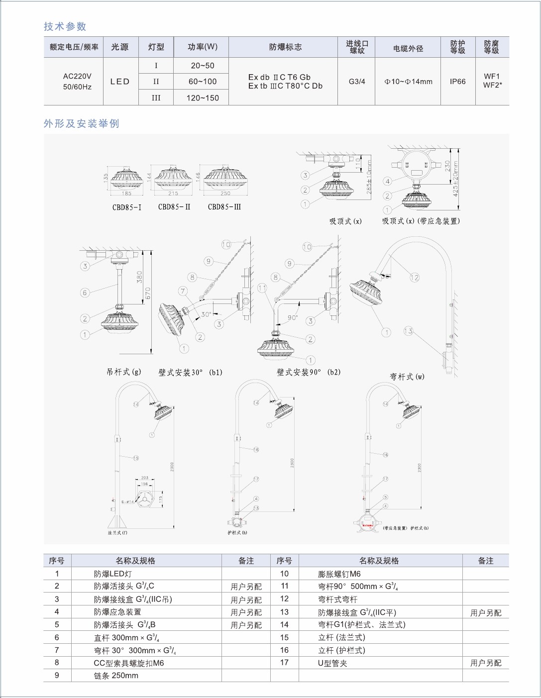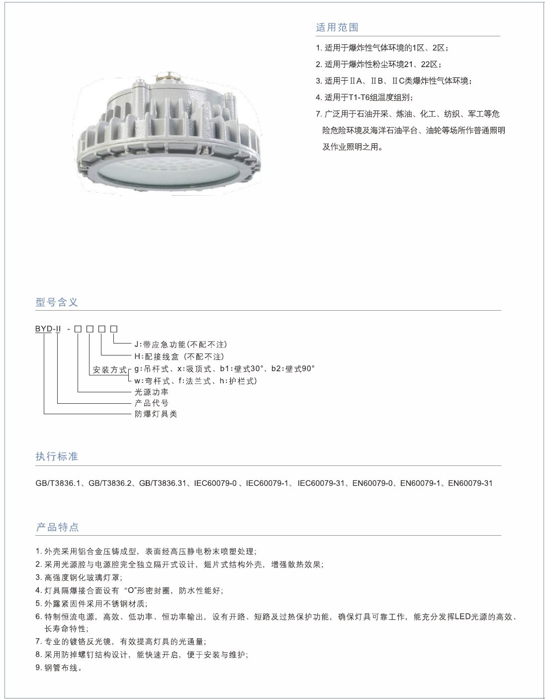 1.外殼采用鋁合金壓鑄成型,表麵經高壓靜電粉末噴塑處理:2.高強度鋼化玻璃燈罩;3.保護網采(cǎi)用鍍鋅(xīn)後浸塑處理,美觀耐用,防腐性能好;4.外露緊固件采(cǎi)用不鏽鋼材質;