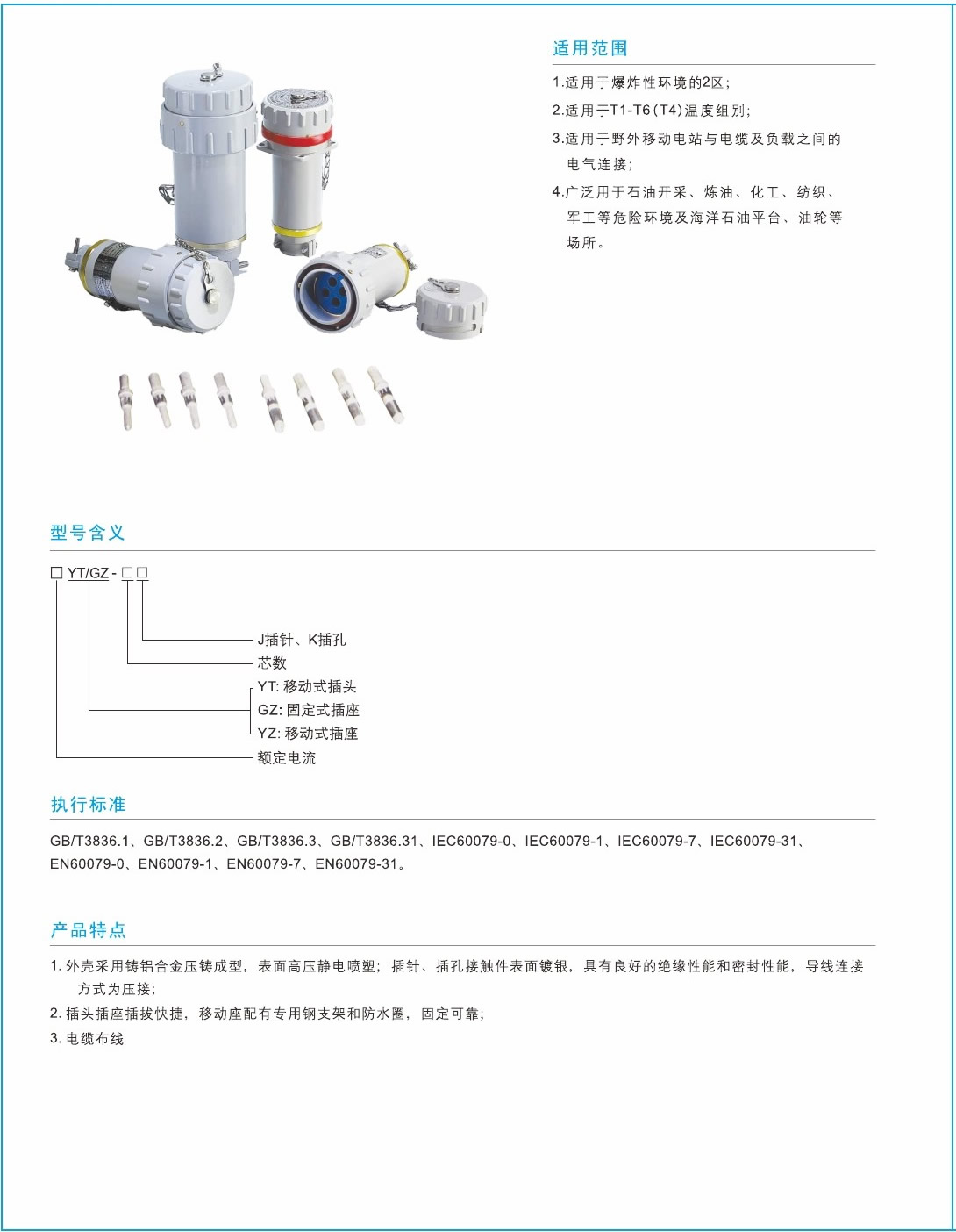 1.外殼采用鑄鋁合(hé)金壓鑄成型(xíng),表麵高壓靜電噴塑;插針、插孔接觸件表麵(miàn)鍍銀,具有良好的(de)絕緣性(xìng)能和密封性能,導線連接